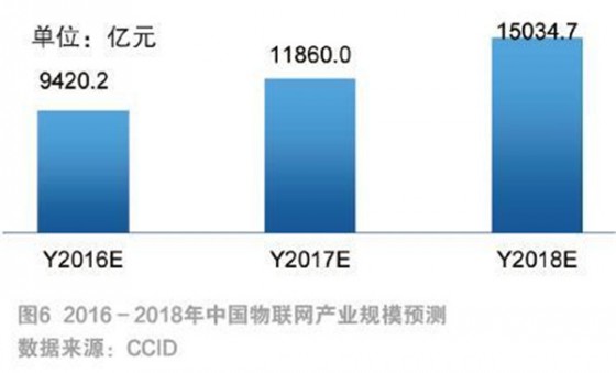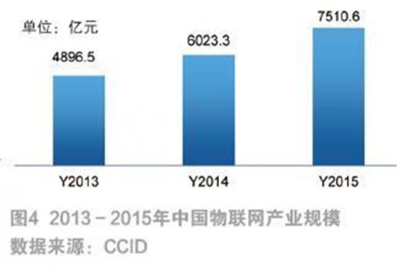 我国就物联网发展也做出了多项国家政策及规划,推进物联网产业体系不断完善。《物联网“十二五”发展规划》、《关于推进物联网有序健康发展的指导意见》、《关于物联网发展的十个专项行动计划》,以及近期颁发的《中国制造2025》等多项政策不断出台,并指出“掌握物联网关键核心技术,基本形成安全可控、具有国际竞争力的物联网产业体系,成为推动经济社会智能化和可持续发展的重要力量。”在物联网发展热潮以及相关政策的推动下,我国物联网产业将持续保持高速增长态势,虽然增长率近年略有下降,但仍保持在23%以上的增长速度(如图3),到2015年,我国物联网产业规模已经超过7500亿元(如图4)。预计未来几年,我国物联网产业将呈加速增长态势(如图5),预计到2020年,我国物联网产业规模超过15000亿元(如图6)。