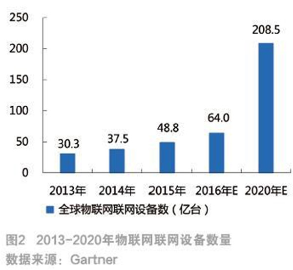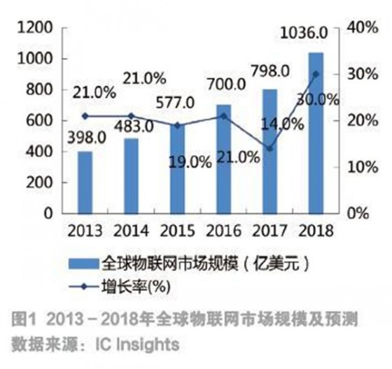 全球物联网市场规模不断扩大,联网设备高速增长,预计到2018年,全球物联网市场规模超过千亿美元,联网设备年均复合增长率保持在31%以上(如图1和图2)。